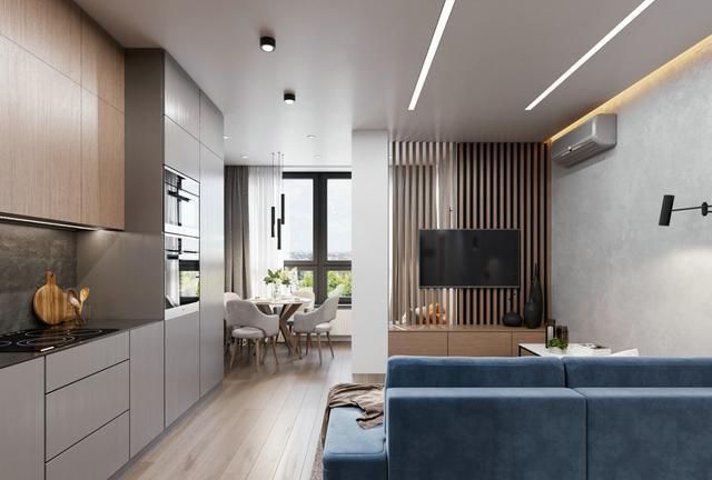 因为户型较小,全屋均以开放式的格局为主,并且以原木地板+混凝土墙面,打造一派轻奢感十足的空间,入户的第一眼,便有赏心悦目之感。