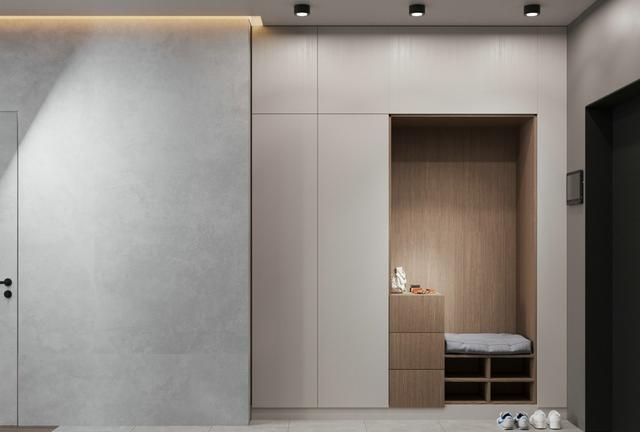 为了满足小户型的储物功能需求,入户玄关的设计,以储物为主需求,一整面玄关柜,满足了空间的储物需求,同时设计师还利用玄关柜,加入了一组内嵌式的换鞋凳设计,米白+原木,更具现代宜居之感。