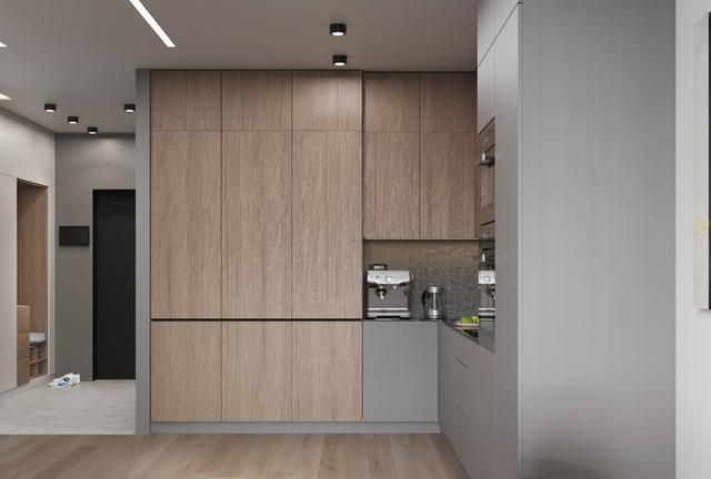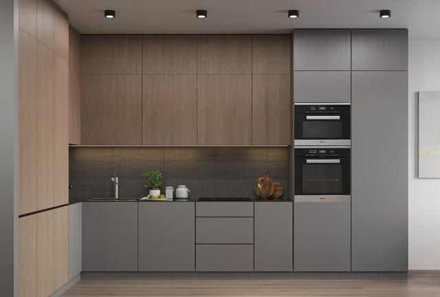 厨房在色调上,以原木+深灰为主,营造层次感十足的氛围,同时L型的橱柜设计,满足厨房各种收纳功能,整个空间小巧却井然有序,毫无一丝杂乱之感。