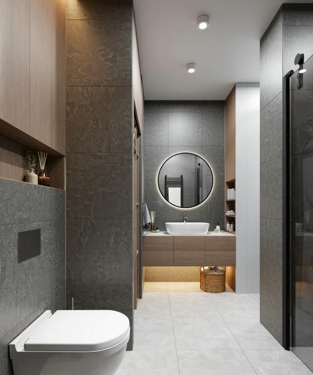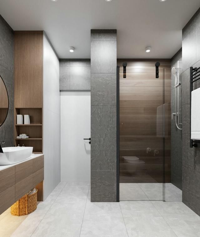 步入卫生间之中,可见一派深色之调,深灰色+原木风,让整个卫生间高级感满满,干湿分离式的设计,让日常使用也显得更为便利和舒适。