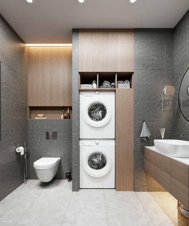 在卫生间之中,还加入了洗衣机和烘干机设计,都藏在了原木柜体之中,即便没有阳台,在卫生间也能清洗和烘干衣物,让生活舒适感十足。