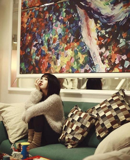 李菲儿豪宅客厅一角,舒适的布艺沙发柔软舒适而又温馨,一幅巨大的现代另类艺术油画装饰在白色墙壁上,独特另类的现代主义风格气息活跃于室内,整个室内更显得别致脱俗,现代气息浓郁。