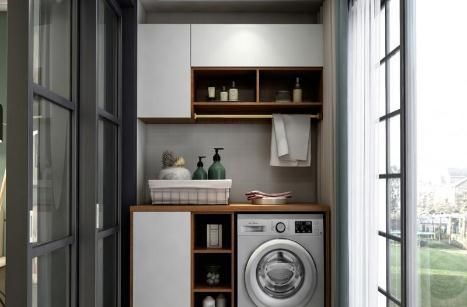 阳台改造洗衣房的好处非常多,最明显的特点就是阳台空间得到了合理利用。洗衣机摆放在阳台上,打造成洗衣房,平时洗完衣服就能马上拿起来晾晒了,非常方便。大部分的洗衣房都是配置洗手台和收纳柜,平时早上起床就不用排队洗漱了,提高了生活效率。而且阳台上有了收纳柜,就可以摆放各种家居物品了,让阳台空间显得干净整洁,装饰效果也非常好。