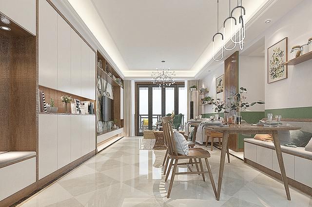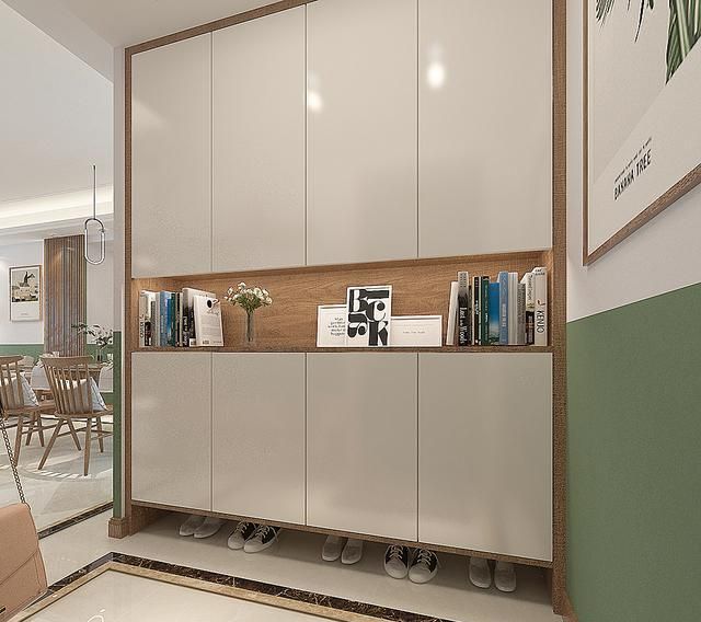 整个空间呈现长方形结构,除了满足进门处鞋柜功能以外,还增加了一组过厅柜,这样从布局上打破了客餐厅过长的格局,又在多余的空间额外增加了储物空间,从动线上把静区动区进行了区分。
