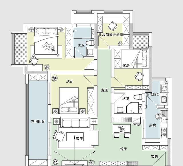 通过与业主的沟通,做出以下设计及改动1.玄关处入餐厅处增加一大面储物柜和边柜。2.衣帽间做隔间式设计。3.客房做榻榻米以及书桌书柜,作为一个多功能房使用。4.厨房处增加部分橱柜,扩大使用面积。