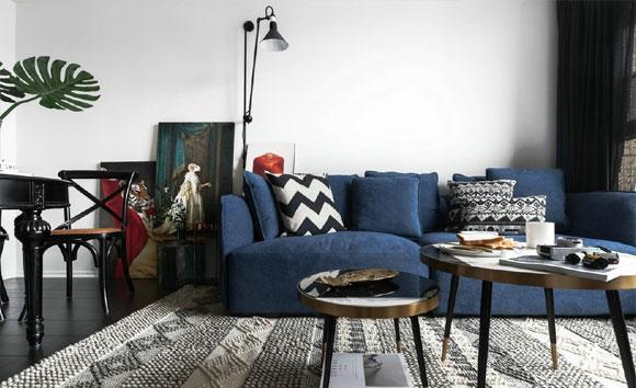 深蓝色北欧风布艺沙发,搭配两张圆形金属小茶几,北欧风的慵懒舒适带来更加舒适更加惬意的家居生活方式。沙发后的墙面没有任何装饰,安装了一盏黑色外罩可伸缩壁灯,辅助照明的同时也让墙面没有丝毫的单调感。平时坐在沙发上看书,打开灯看的会更清楚。