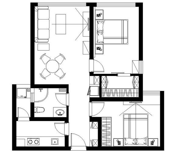 先来看看本案的户型图,标准的小两房型户型,两间卧室一个卫生间,客餐厅一体的空间布局,虽然有些拥挤,但对于一家三口来说还是够用的。主卧室的面积非常不错,甚至隔出一间独立的衣帽间,不仅有着更好的收纳能力,也让家居生活更加惬意。