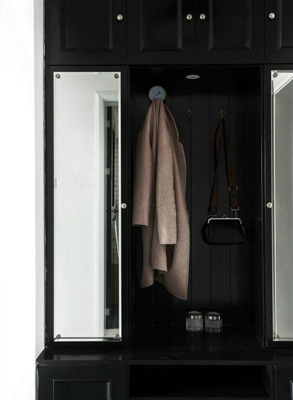 进门右手边利用墙面定制了一组黑色的鞋柜,并且安装了两面换衣镜,方便出门前检查装扮的同时,也起到了拉伸空间的作用。大面积的黑色鞋柜,让人一进门就能感受到屋主另类个性的诉求。