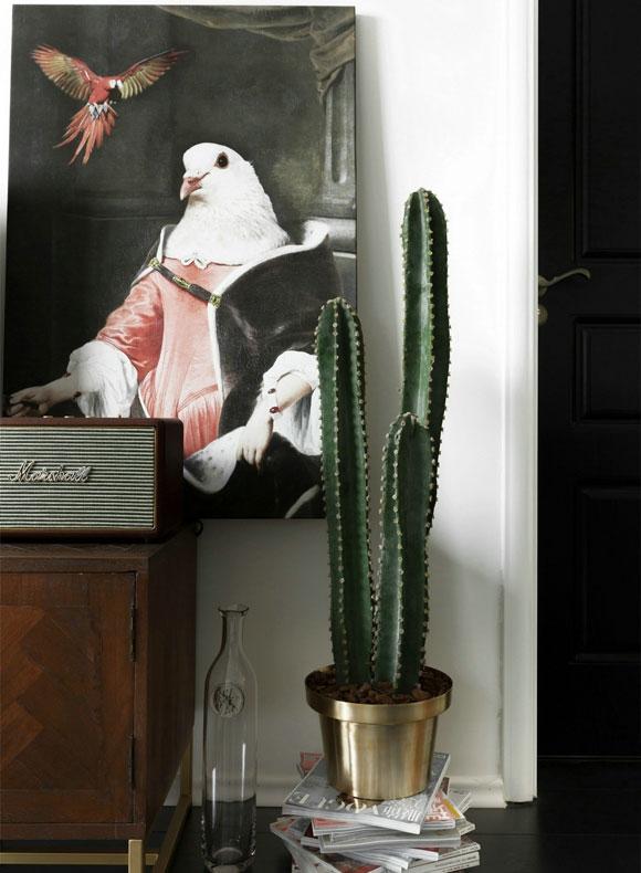 电视背景墙没有过多设计,购置了一张深棕色的电视柜,造型有点复古的电视柜或许不是很时尚,却与整个空间的设计效果非常匹配。一幅大尺寸的装饰画直接摆放在电视柜上,黑色为主的画面看起来同样非常有个性。种有仙人掌的金属花盆直接摆放在电视柜的一侧,装饰空间的同时,也让北欧风为主的空间别具了一番格调。
