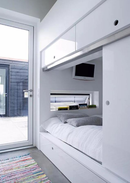 最最厉害的一种就是把所有的东西做个整合,卧室里的卫生间,床,抽屉,柜子,书架,衣架全部都镶到同一个衣柜里。只要打开卧室其实看到的就只有一个衣柜,然后衣柜再打开才是我们真正的卧室,但是里面设施非常齐全。这样看也是很神奇的,试想一个柜子,有各种各样不同形状,不同大小的门,打开一个就是不同的东西,甚至里面还有另外一个房间,相信如果朋友看到这样的房子也会很羡慕吧。