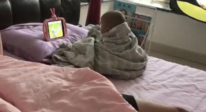 但这位宝爸带娃时却并没有上心,小孩醒来之后,宝爸给他穿好了衣服,两个人便在空调房各玩各的。爸爸躺在床上,盖着一条被子看起了手机,而小孩前面是一个播放动画片的平板。可能是在空调房太冷了,这位爸爸还不忘给小孩披上一条被子,父子俩别提多享受了。