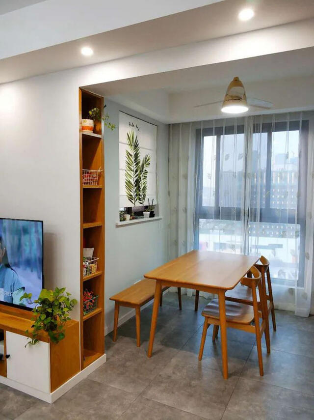 餐厅是一个独立空间,两边都有窗户,光线自然是很充分的。小窗户的台面上还可以放置一些小绿植,结合着电视背景墙和电视柜,做上一竖排的小收纳空间。用收纳篮进行收纳小东西,餐边柜的责任也可以承担起来。