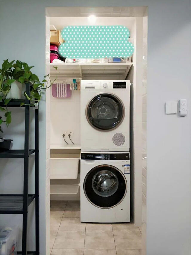 餐厅对面是洗衣间,家里的换洗都放在这里解决,洗衣机和烘干机什么的,都备的很全。