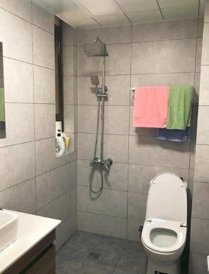 我们家的厕所没有做干湿分离就是简单的做了一个淋浴和马桶,因为当时做淋浴房的话,其实造价还是很高的,我们要省一点钱,所以就没有做干湿处理,我们想的就在厕所的门口放一个垫子,每次出来的时候踩一下垫子应该会好一些。