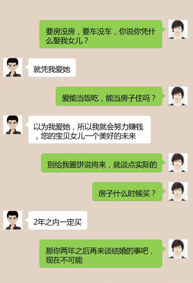 结婚就是兑现金钱和实力的时候,如果你说那些不现实的话,没有人会把女儿嫁给你的,等你赚够了钱,她早就嫁给别人了。爱情用来谈恋爱还是可以的,但是用来结婚好像不太好使啊。