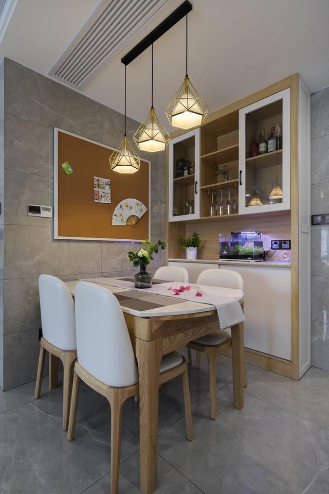 隐藏在拐角的餐厅,简易实用又不缺乏收纳。一组通高的餐边柜,使得餐厅杂物得到合理的收纳。简易造型的桌椅,自然的纹理、柔和的色泽,让人感受到自然的气息。餐厅墙面设置了软木墙板,可以记录生活美好时刻也可以留言。线条感十足的吊灯,暖色调的灯光,为餐厅增添了一抹温馨。