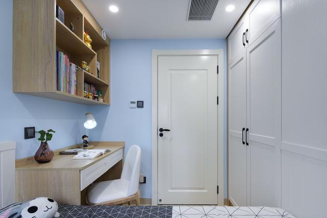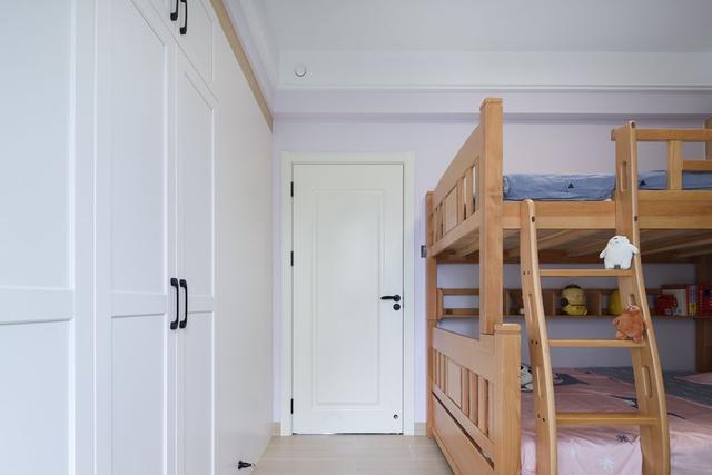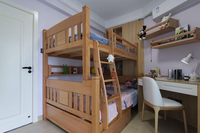 儿童房整面墙的收纳柜设计,保证了充足的收纳空间,让空间井井有条。高低床提高了空间利用率,利用空间结构布置简易桌和置物架。