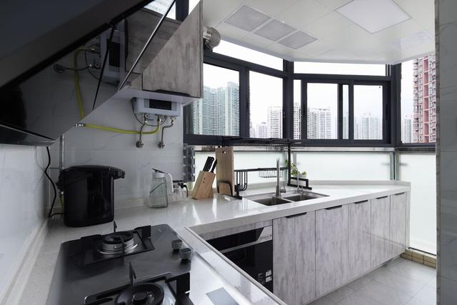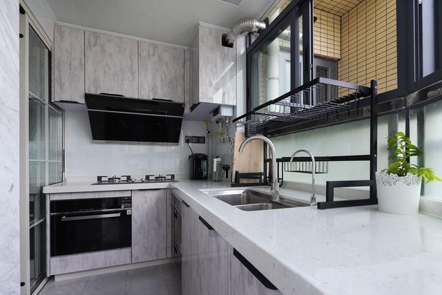 入户阳台改造的厨房,不规则的橱柜设计,弥补了户型的缺陷,良好的采光提高了视觉宽敞效果。嵌入式厨房电器,美观实用。