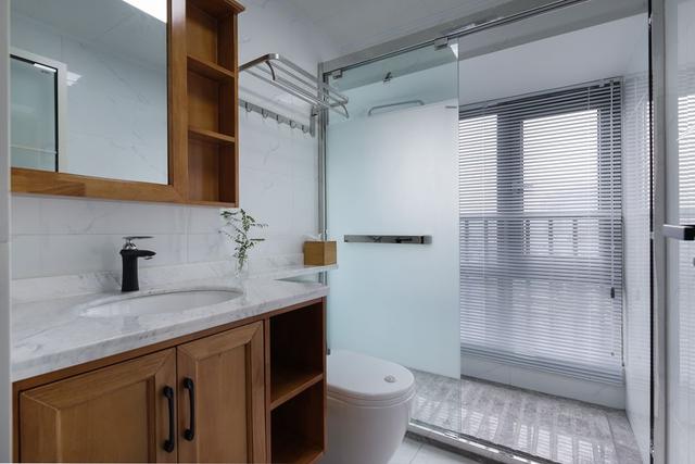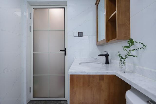 卫生间大理石的洗手台与墙面宛如一体,洗手台一直延伸到马桶上方,可以用于收纳,不需要再单独安装纸巾盒。磨砂玻璃门做隔断,引入光线又提高私密。