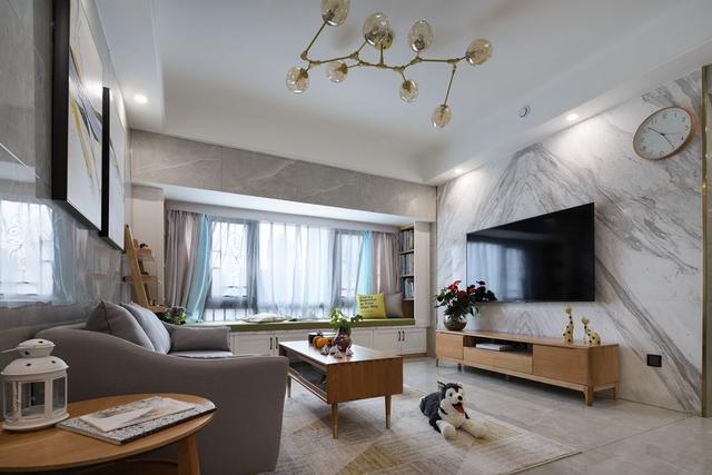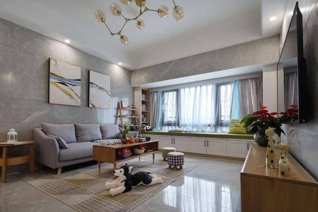 客厅,灰色纹理的瓷砖覆盖整个墙面与地面,搭配柔和的家具,视觉上不单调,也不会太过冰冷。靠窗设置了一排地柜,可坐可躺还增加了收纳。