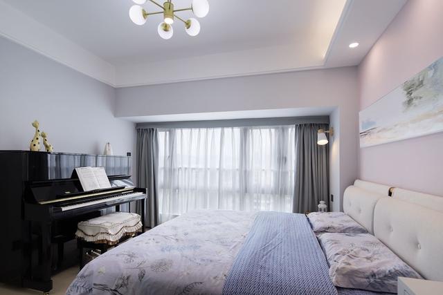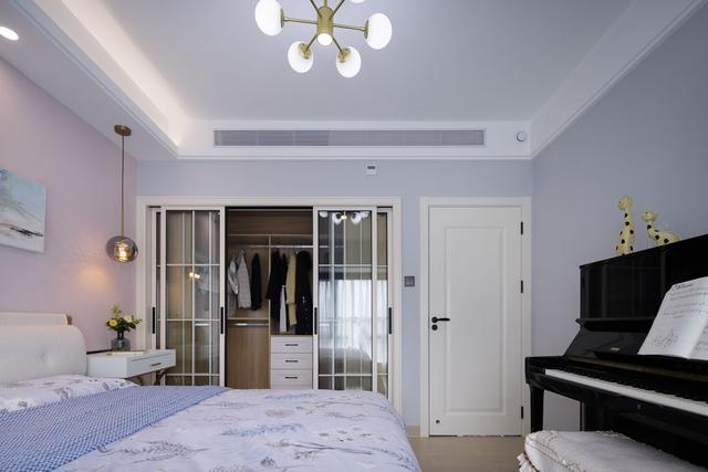 主卧舒适宜人,淡粉色的床头背景,让空间多了些许温馨明快,床头挂画与床品相呼应,别有一番诗意。改造后主卧实现了衣帽间功能,满足了女主人对衣帽间的向往。玻璃门隔断保持通透感,空间也不显拥挤。