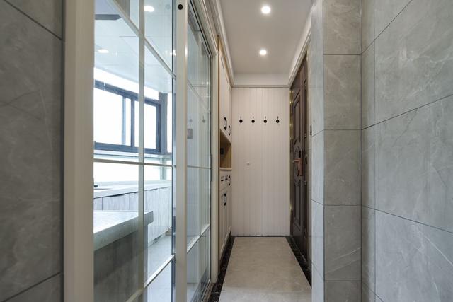 合理的空间分割,将原本宽敞的入户空间划分为门厅和厨房,鞋柜和玻璃门结合做隔断,既保证了门厅收纳,又兼顾了采光通透。门厅采用无主灯设计,高度更统一,照明效果也更舒适均匀。