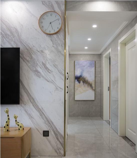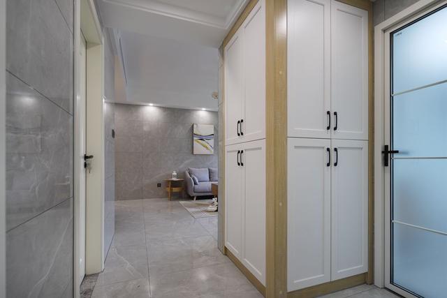过道尽头利用一幅抽象画装饰,增添一丝艺术气息让空间不单调。格局变化后,过道增加了一组转角收纳柜,与墙面完美的结合,丝毫不影响美观。