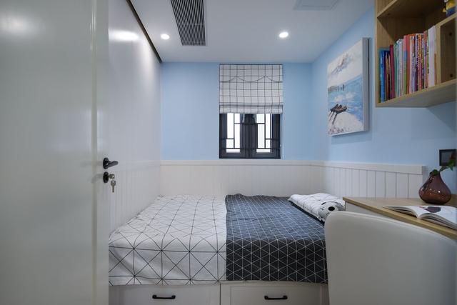小卧室蓝白色为主调,没有多余的装饰设计,整个空间干净硬朗充满活力。简单的书桌和吊柜满足了日常使用。黑白格子的床品与窗帘呼应,简洁大方。