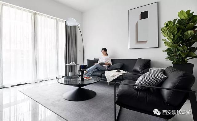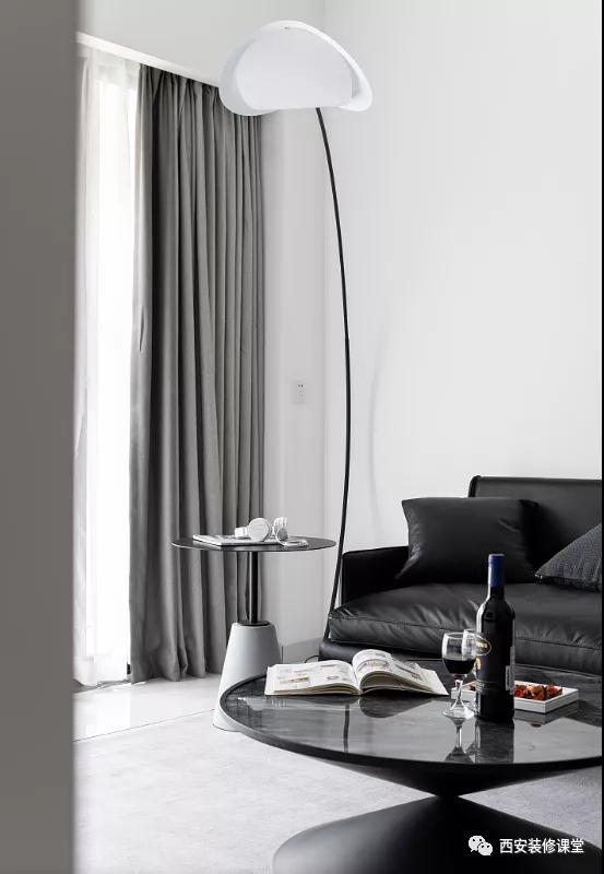 ▲正宗黑白灰,每一件物品都遵循设计的思路,黑白灰贯穿整体:黑色的皮质沙发与单椅统一,黑色的锥形茶几,黑色的落地灯搭配白色的灯罩,甚至是背景的挂画也是黑白抽象,灰色的地毯提升层次和温馨度。同时空间小,注重视觉的虚实感觉,让色彩的搭配与空间的协调做到完美