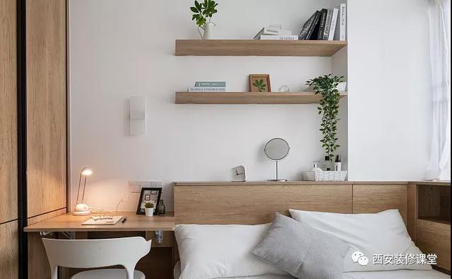 ▲书桌与移门衣柜严丝合缝,空间利用到位,床头简单隔板作为展示使用,视觉尽可能简洁,减少压抑