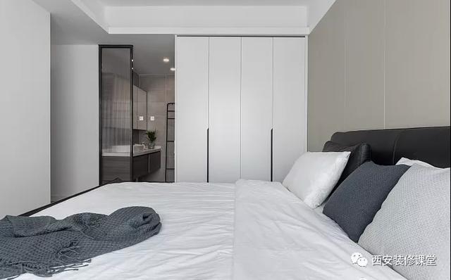 ▲主卧空间延续黑白极简,为了视觉温馨,背景采用了灰色的硬包处理,同样是极简线条勾勒,与旁边衣柜协调统一;主卫原来的格局做了变化,拉通定制浴柜,采用颜值高的长虹玻璃隔断分割,区域划分同时提升整体视觉质感