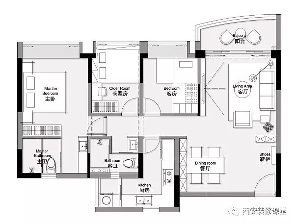 ▲这是设计后的格局。大格局没有变动,客厅餐最多的就是定制收纳空间,让黑白质感的家保持整洁;进门直对客厅,像好多父辈一样,小夫妻执意还是做了分割的玄关;改动最大的厨房,缩小了洗衣间,扩大厨房的使用空间;把客卫做了干湿分离;主卫同样做了干湿分离处理,同时扩大的浴柜的储物能力;顶头是主卧小两口住,中间卧室暂时布置成父母房,隔壁房子是客房,因为目前没有小孩,暂时两人居住