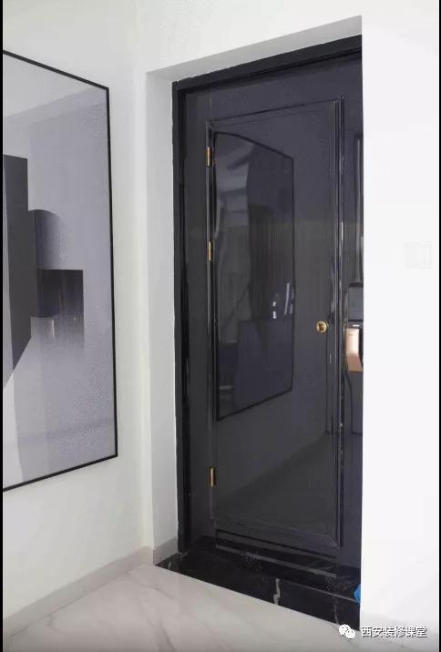 ▲因为是二手房,更换防盗门物业再也没有干涉,所以干脆根据自己的喜好,更换成了纯黑色的款式,紧挨有没有鞋柜,进门又不会触碰墙面,所以入户门套节省了;为了平时通风的需求,专门选用了门中门的功能,这样夏天既能防盗,又解决了纯南户型通风不畅的问题。进门右手空墙一副黑白挂画装饰,延续风格,同时也是为了遮挡下方的弱电箱