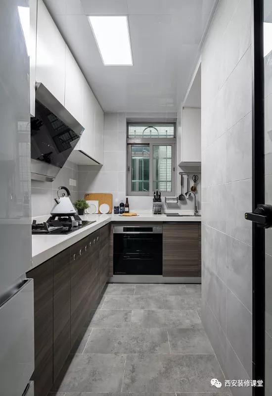▲黑色极窄边框的全景门,单开门冰箱满足功能;地面是灰色瓷砖工字型铺贴,墙面柔光浅灰色瓷砖,木色地柜与白色吊柜的搭配,整体素雅柔和,烹饪区做到舒适清爽