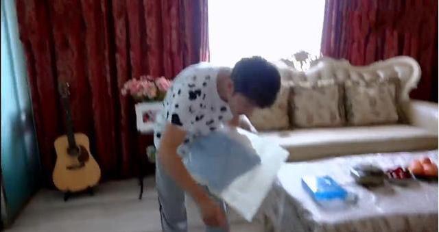 这个角度可以看到沙发前面是茶几,铺上了带有花色的台布,桌上放着一些水果,看来平时应该是没有喝茶的习惯。沙发旁边是一个花架,过去是一把吉他,这把吉他是陈翔经常带在身边的,出镜率还是挺高的,也说明他虽然近两年更多的重心在综艺上,但并没有忘记歌手的初心。