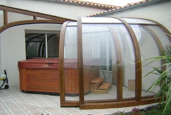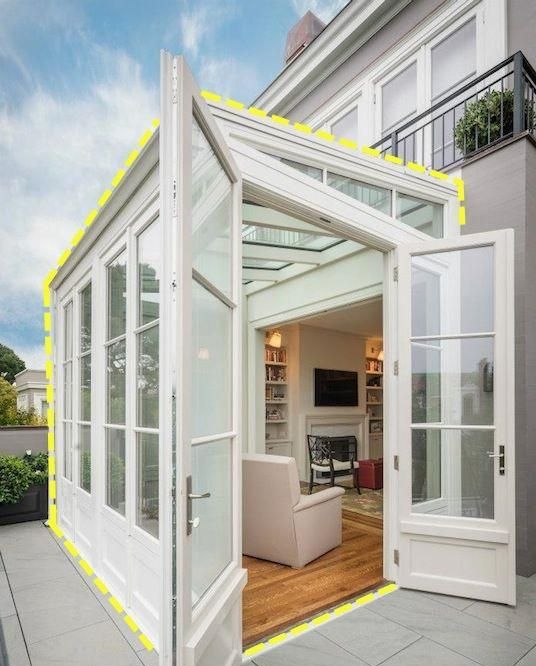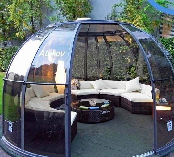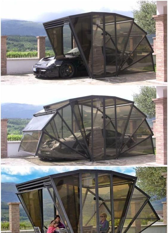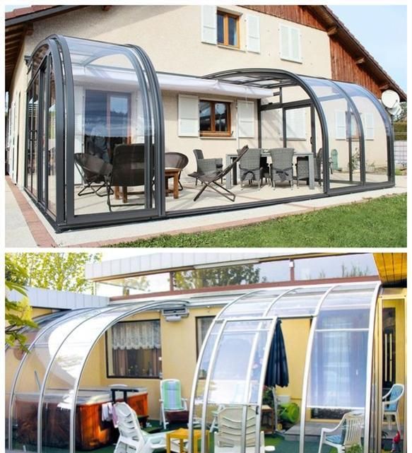 还有个差不多的利用,就是下面这种可旋转的遮阳棚,也能实现阳光房的效果。不过这种利用范围有限,毕竟需要根据高度,确定可容纳的面积,大多数人更喜欢用在靠着院子的落地窗前。
