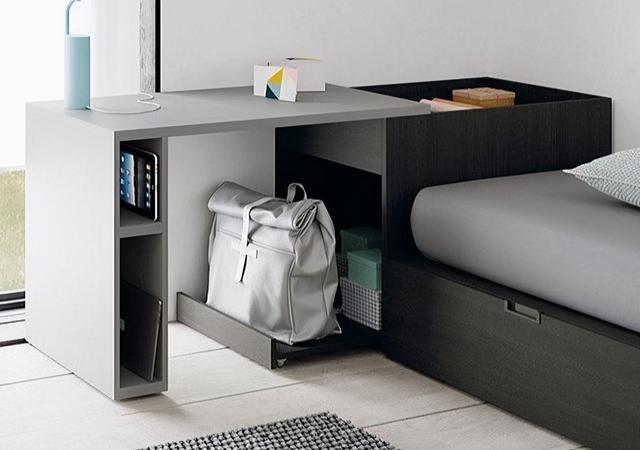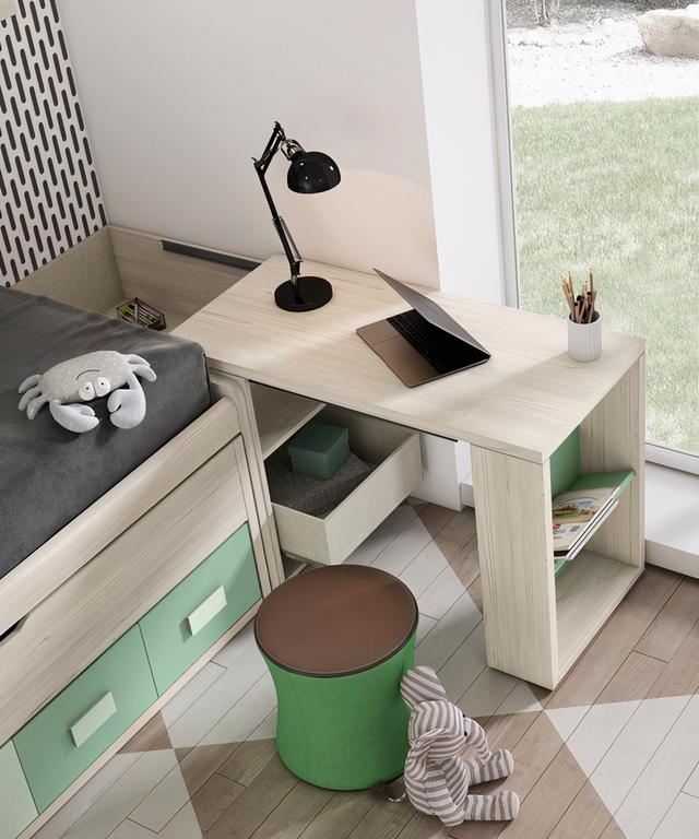 移动书桌的设计让小房间瞬间为孩子多出一张学习桌,侧面的开放搁架可以作为书架,摆放学习资料和学习用具等,增添房间的书香氛围,走心的设计让床头柜实现大功效,是不是很贴心呢~