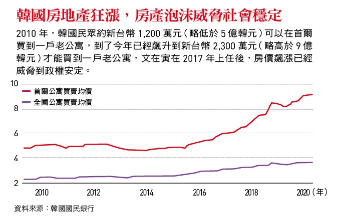 韩国房地产涨势难以遏止,是文在寅政府存续最大的威胁,文在寅内外交迫,与北韩的问题越搞越僵,与日本关系陷入战后最剧烈对立,跟美国川普政府不对盘,新冠肺炎的确诊与死亡又是东亚最严重的,但是,国家战略层级问题虽然棘手,杀伤力却远不如房地产泡沫。律师出身、反财团的文在寅,让韩国全国的房地产价格不断创新高,让他的学运与工运等左派核心支持者对他非常不满。