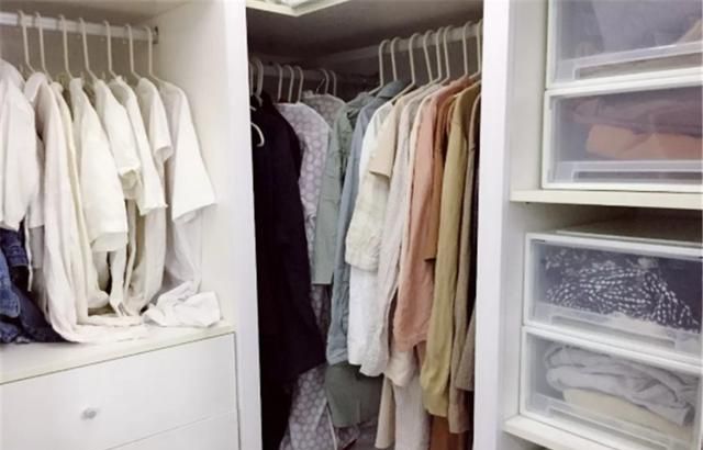 就在卫生间旁边,打开门进入后,不大的衣帽间,衣服却摆放的井然有序。