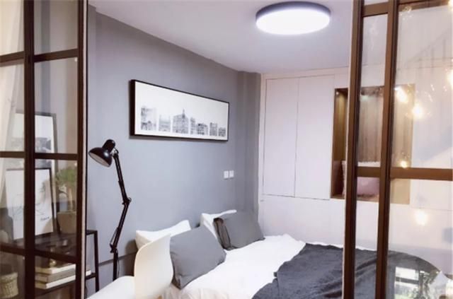 虽然次卧1号房间的层高有限,但通过黑框玻璃隔断的设计,让屋外光线也完好射入屋内,通透敞亮;内部放置了榻榻米和嵌入式衣柜,节省空间又舒适;