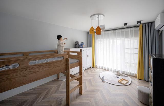 小孩房的整体色调以明亮为主,并且还搭配了明黄色作为点缀,从而营造出敞亮干净的居住环境。而在布局这块,则基本上是以留空为主的。毕竟孩子很小,本身就比较好动。再者,预留的空间后期也是可以再次做规划的。