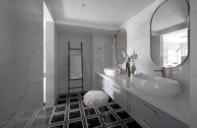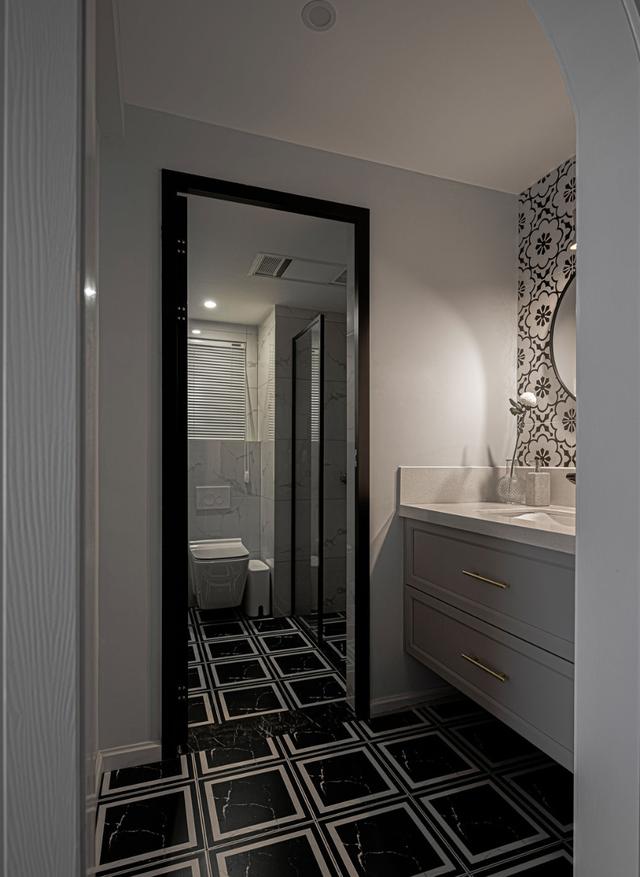 当卫生间墙体做了外延处理之后,空间扩大的感觉还是非常明显的。外面做台盆,增加生活的便捷性,内部则保留马桶及淋浴功能的。不过最抢眼的还是地砖这块,黑白回形的饰面,既能与整体风格统一,也显得很上档次。
