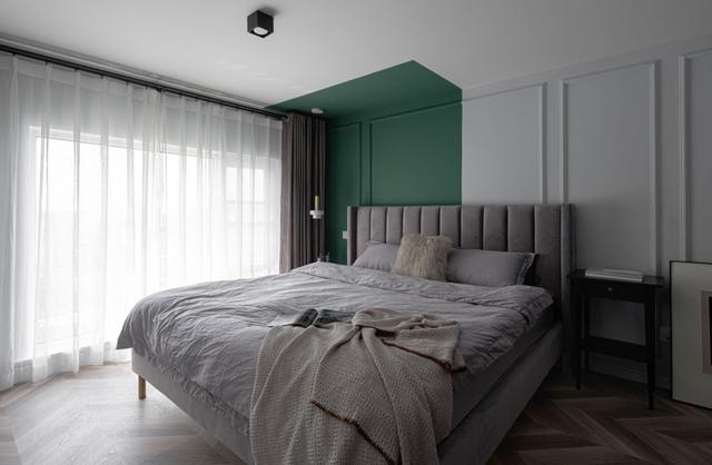 主卧的床头背景设计和沙发墙一样,都是采用了线条及双拼色来处理的。只不过考虑到卧室的层高比较有限,为了提升视觉效果,就将绿色部分延伸到了顶部。这样既有了一定的装饰性,也增加了一点趣味性。而灰色的丝绒面大床,也表现出了舒适性。