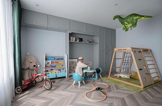 由于家里的孩子很小,且玩具比较多,将这间卧室改成活动区,不仅让孩子有了充足的玩耍区,也方便了亲子教育。当然,随着孩子慢慢长大,该空间功能也可以随时做改变的。比如墙面柜子的留空位置,就是用来摆放钢琴的。