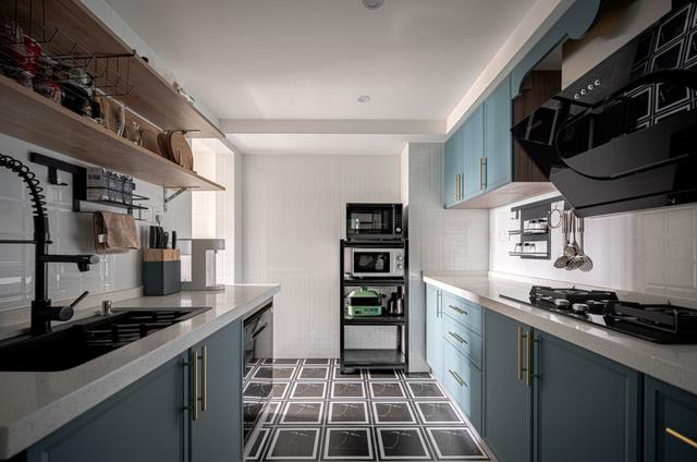 橱柜采用了左右分离的方式来规划,既做到了干净利落,操作空间也不俗。而金色的拉手搭配上蓝色的柜门,也突显出了精致感。为了不遮挡采光,正对面墙体选择装饰架来收纳电器,也算是比较实用的做法了。而外面的小阳台,则是当作洗衣间来使用的。