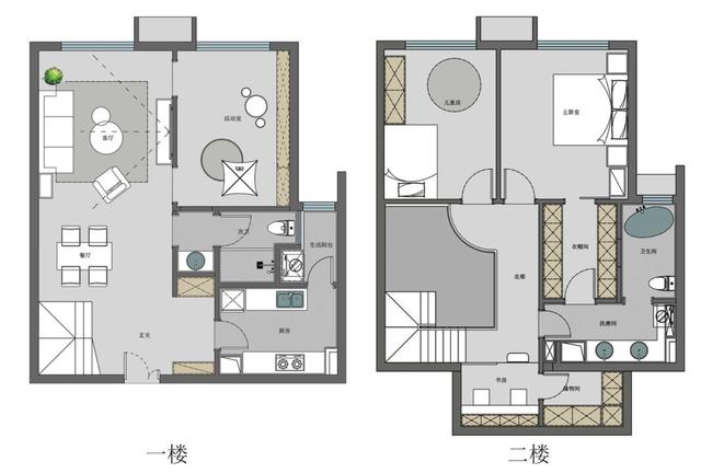 2、将一层卧室与客厅打通合并,在提高空间感的情况下,并将原空间改成孩子活动区。