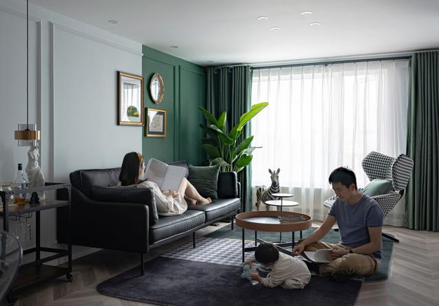 来到客厅,为了使空间看起来更具格调精致性,沙发墙采用了蓝绿双拼色来处理的。再加上墙面的线条装饰,既有了很丰富的层次感,也突显了温馨自然的韵味。而黑色的皮沙发、深绿色的地毯、以及千鸟格饰面的单人沙发,也都将精致、高贵、档次给表现了出来。