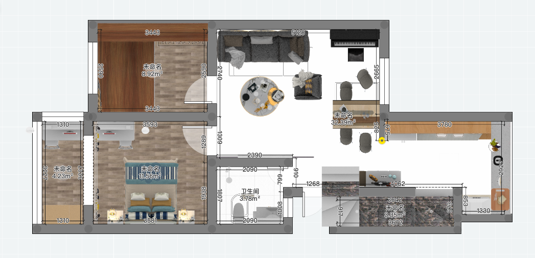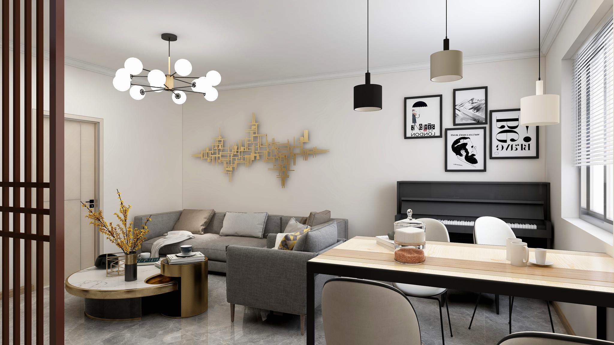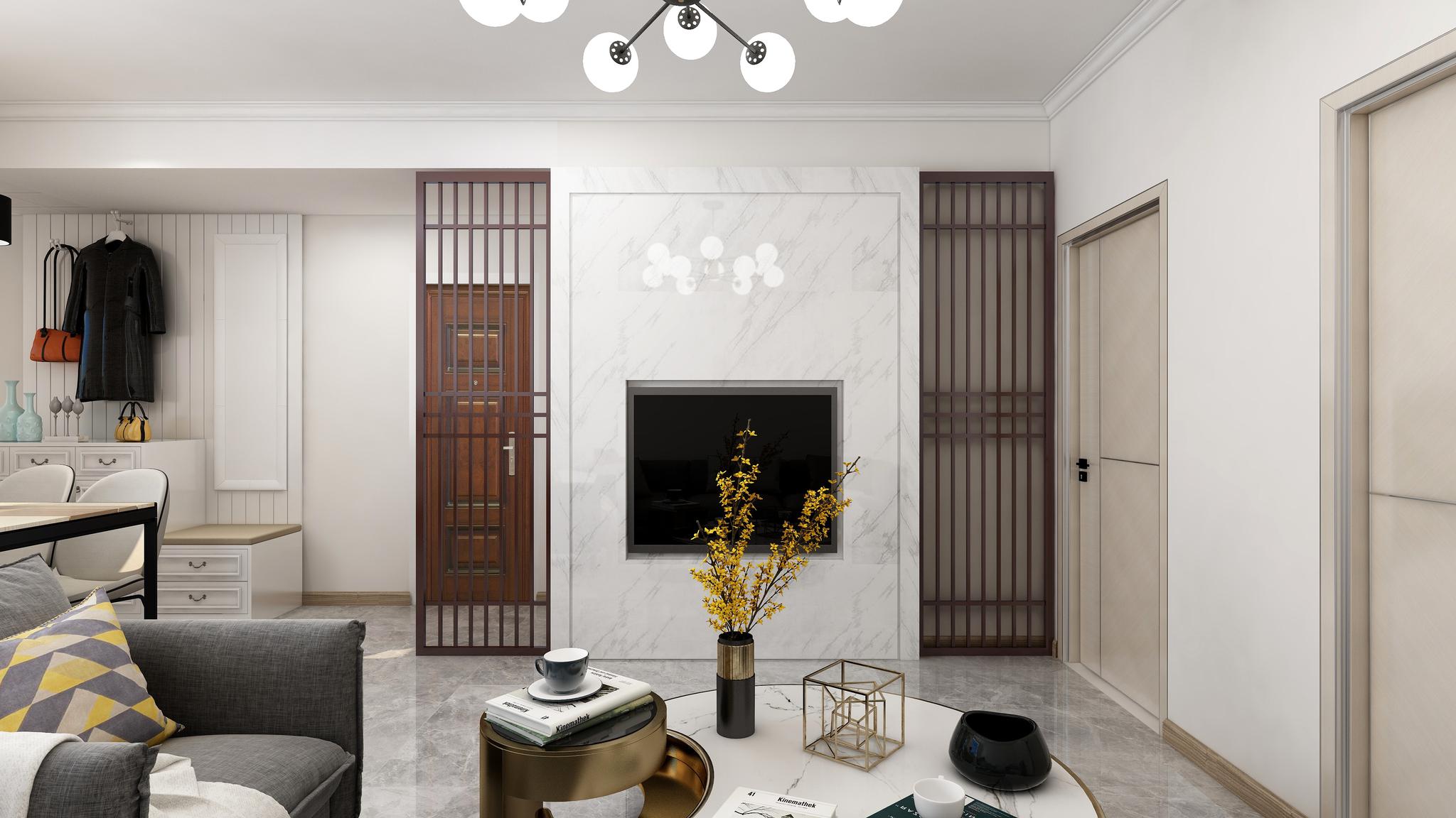 客厅地面采用通体大理石瓷砖,吊顶为当下流行的双眼皮吊顶,木制作为原木色。