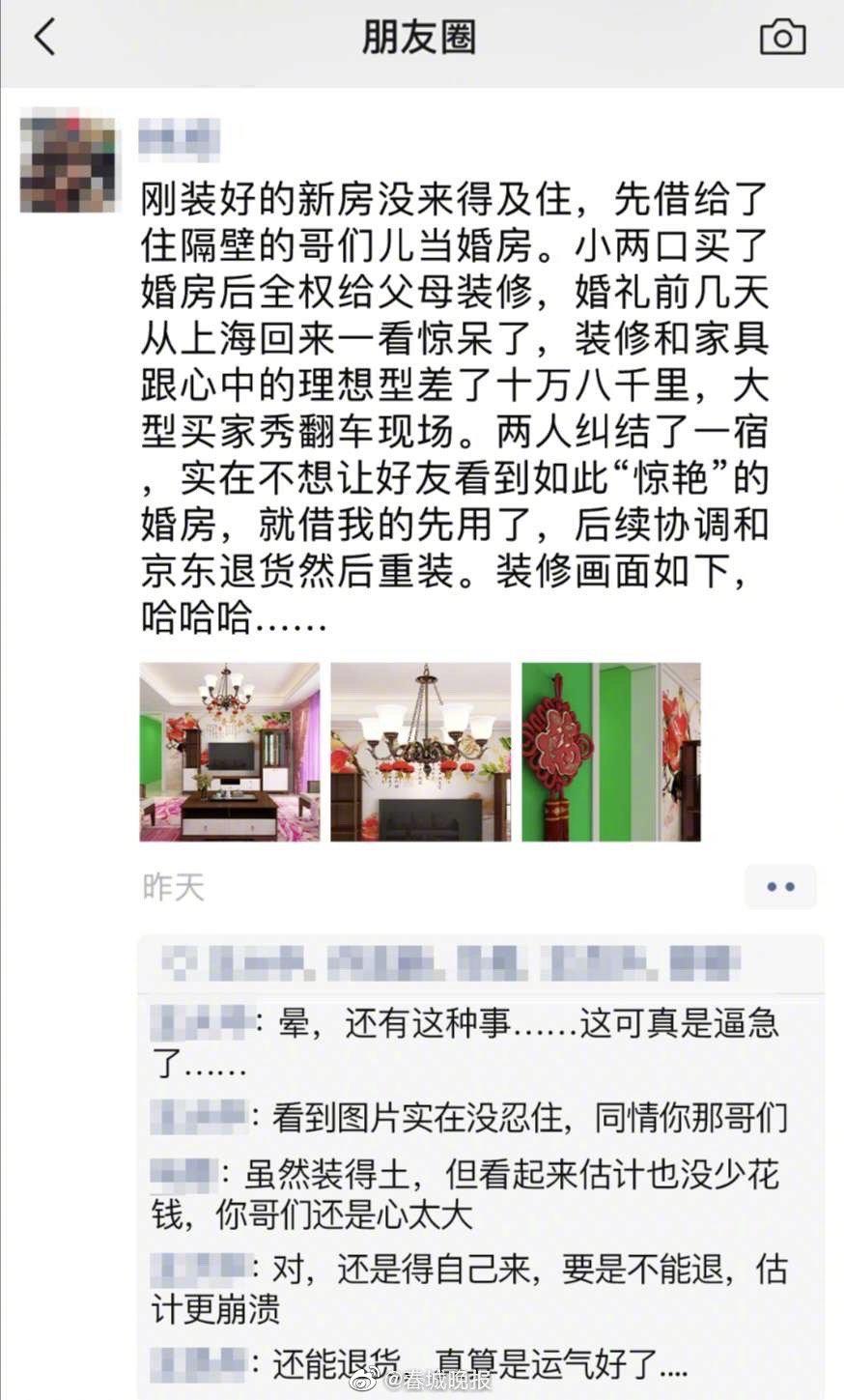 【审美代沟?#嫌父母装修太土小夫妻借房结婚#】去年底,在上海工作的小郭和未婚妻在贵阳购置了房子当婚房,交由父母装修。近日两人回家办婚礼,一看惊呆了:父母花20多万元装修的房子充满“土味”不忍直视,无奈下向好心邻居借了新房当婚房“救急”,幸好后来顺利退货重新装修。对此,有网友认为是审美代沟,也有网友觉得两人心太大,婚房得自己装修,你怎么看?http://t.cn/A6bgnMA1
