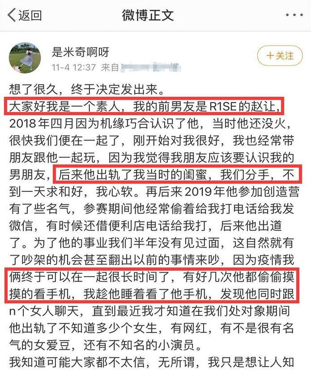 根据这位网友的介绍,两人是在2018年4月认识的,恋爱的细节也是非常甜蜜。男方对她很好,经常和朋友一起玩耍。但是后来赵让出轨了自己的闺蜜,本来已经分手谁知道第二天又来求和,所以又在一起了。之后赵让参加了《创造营2019》,即便有了一些名气都还会想着办法给女方打电话,看来两人曾经是真的相爱过吧。后来因为大环境不允许活动,所以两人可以长时间在一起,偶然间偷偷看到赵让的手机,才知道他居然和很多人同时聊天,其中包括网红、女偶像以及小演员。